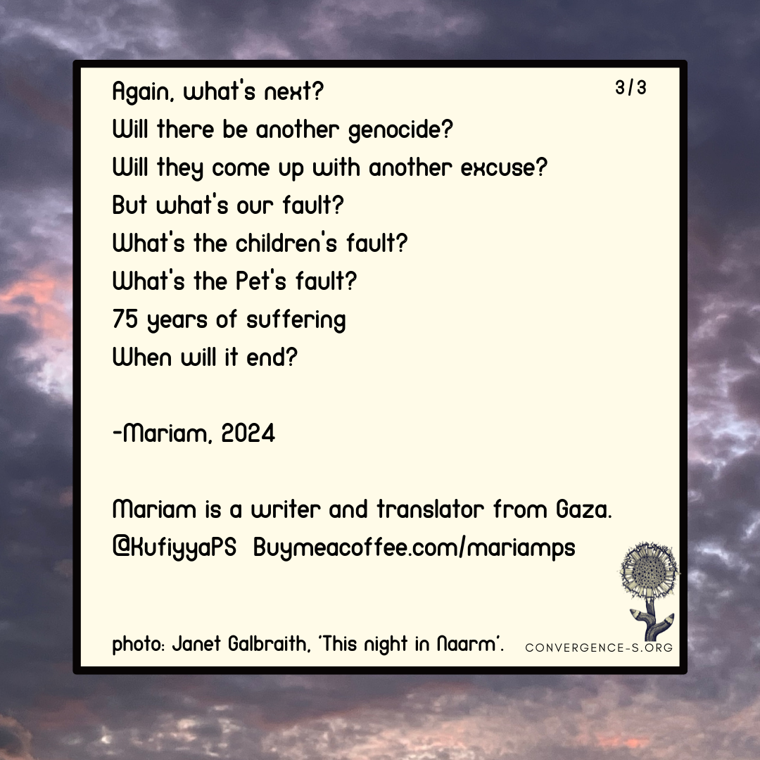 Mariam is a writer and translator from Gaza. You can follow her on X/Twitter as Mariam from Gaza, @KuffiyyaPS.