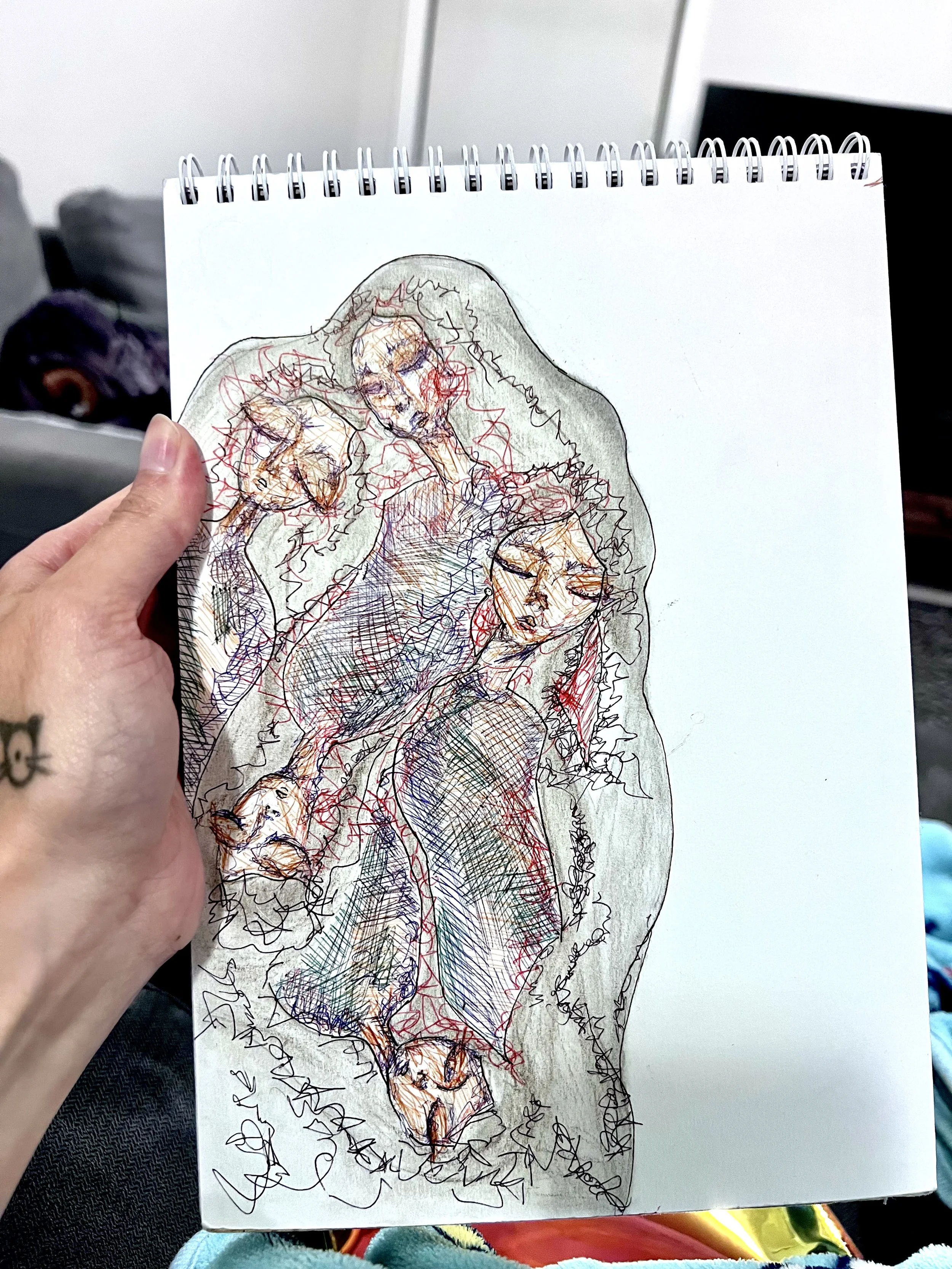 Artist holds the original drawing worked into the above art work.